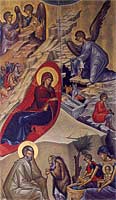 and the Dormition of the Theotokos. The dark cave contrasts with the brilliance surrounding it.