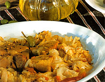 Remove the mean and set aside. Add the chopped onion to the pan, and brown in the oil. Add the strips of white cabbage to the pan and braise for a few minutes, stirring occasionally, until they wilt. Add the diced tomatoes ad return the browned meat to the pan. Season with salt and pepper.